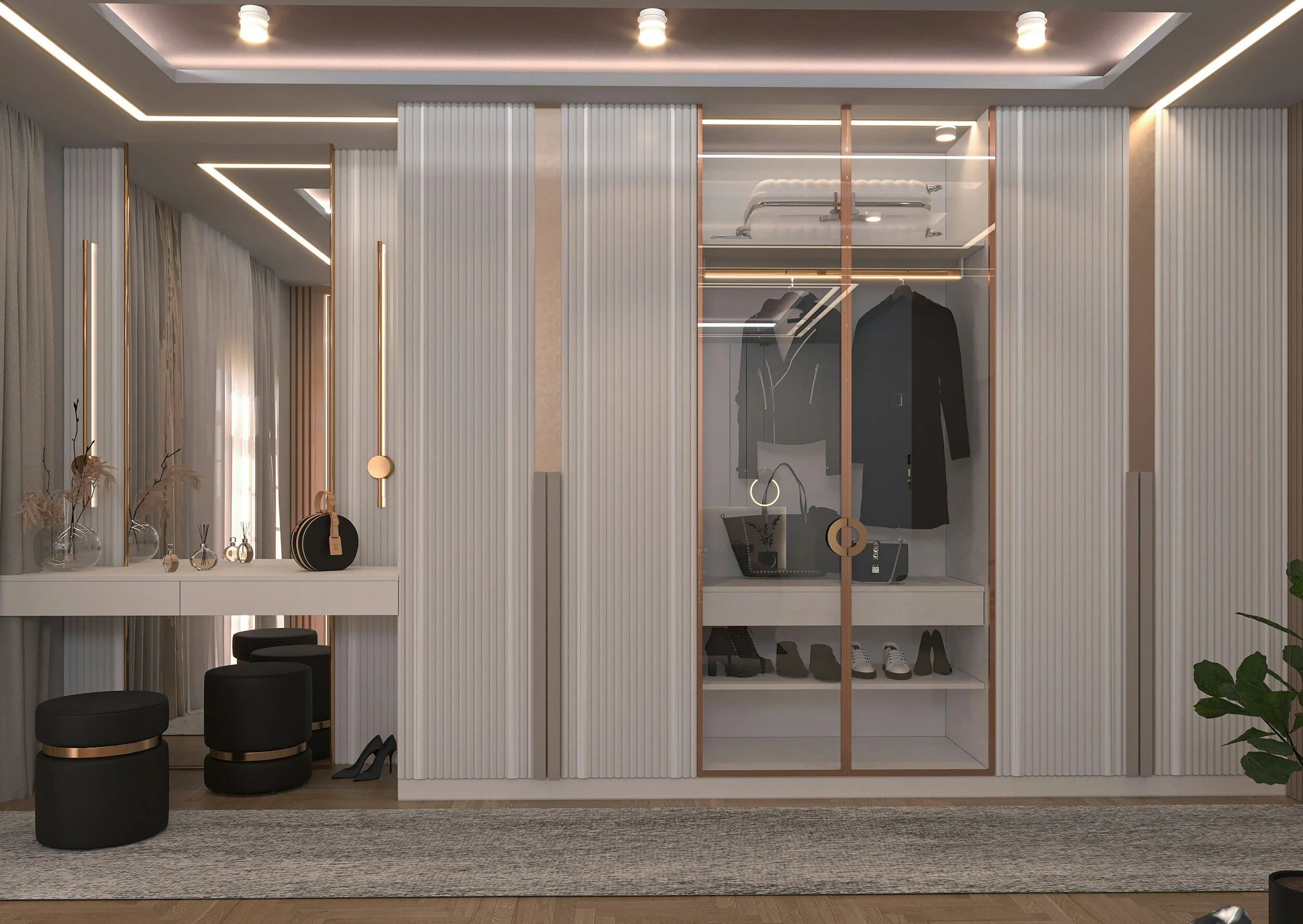 Our specially crafted Jewellery System, shoe rack, glass shelf, handles, knobs and led lights add elegance and uniqueness to the whole system.